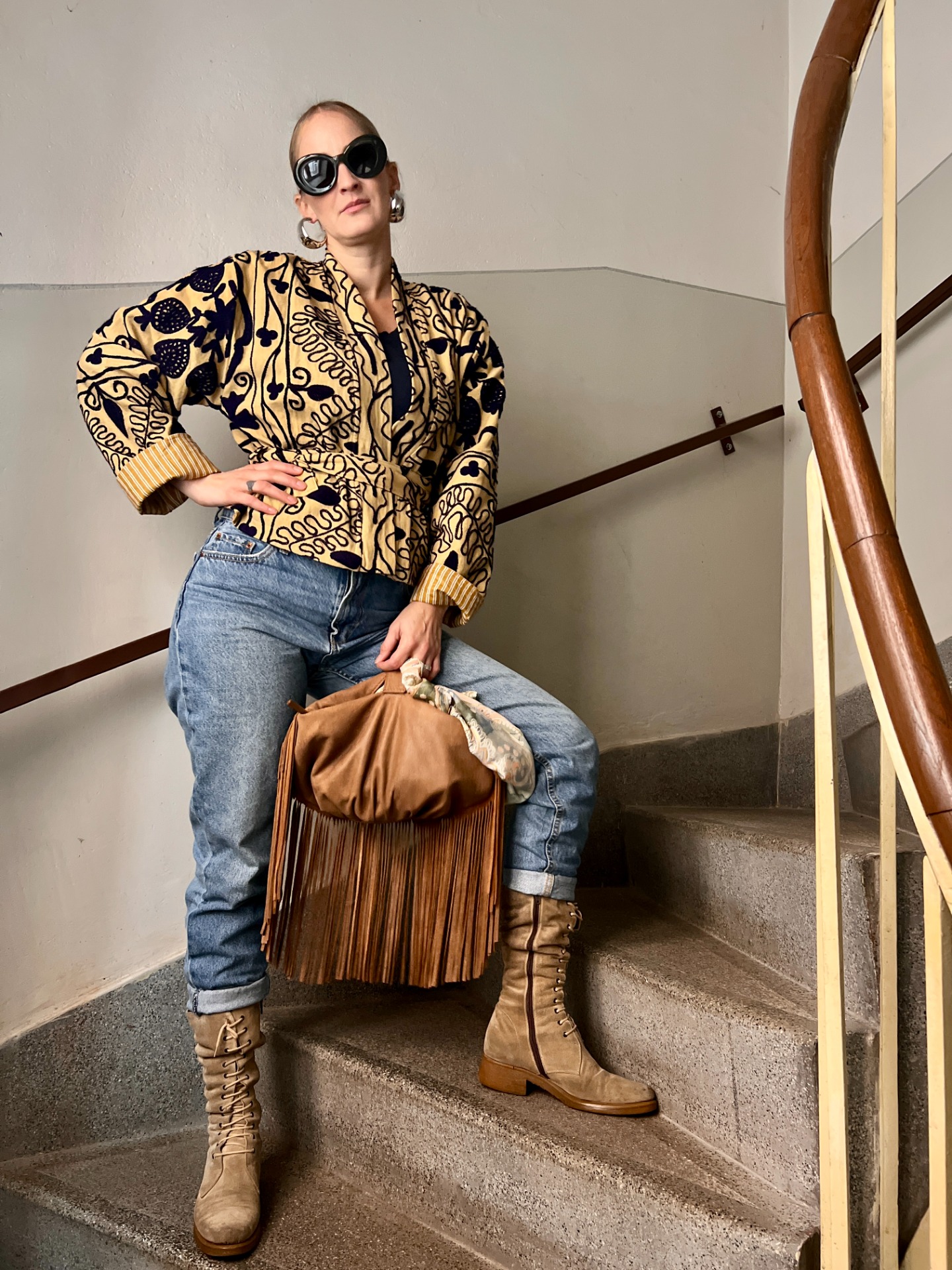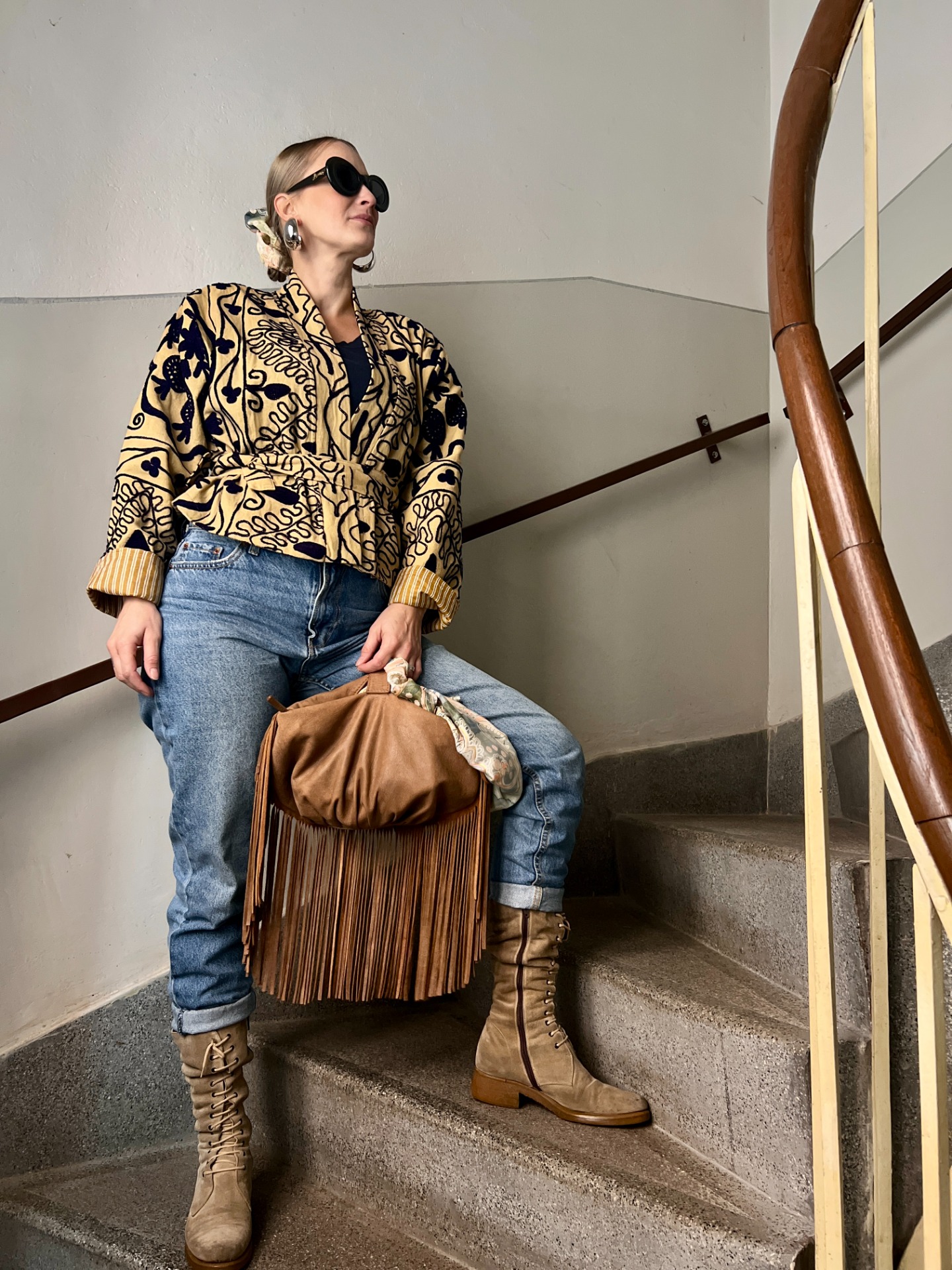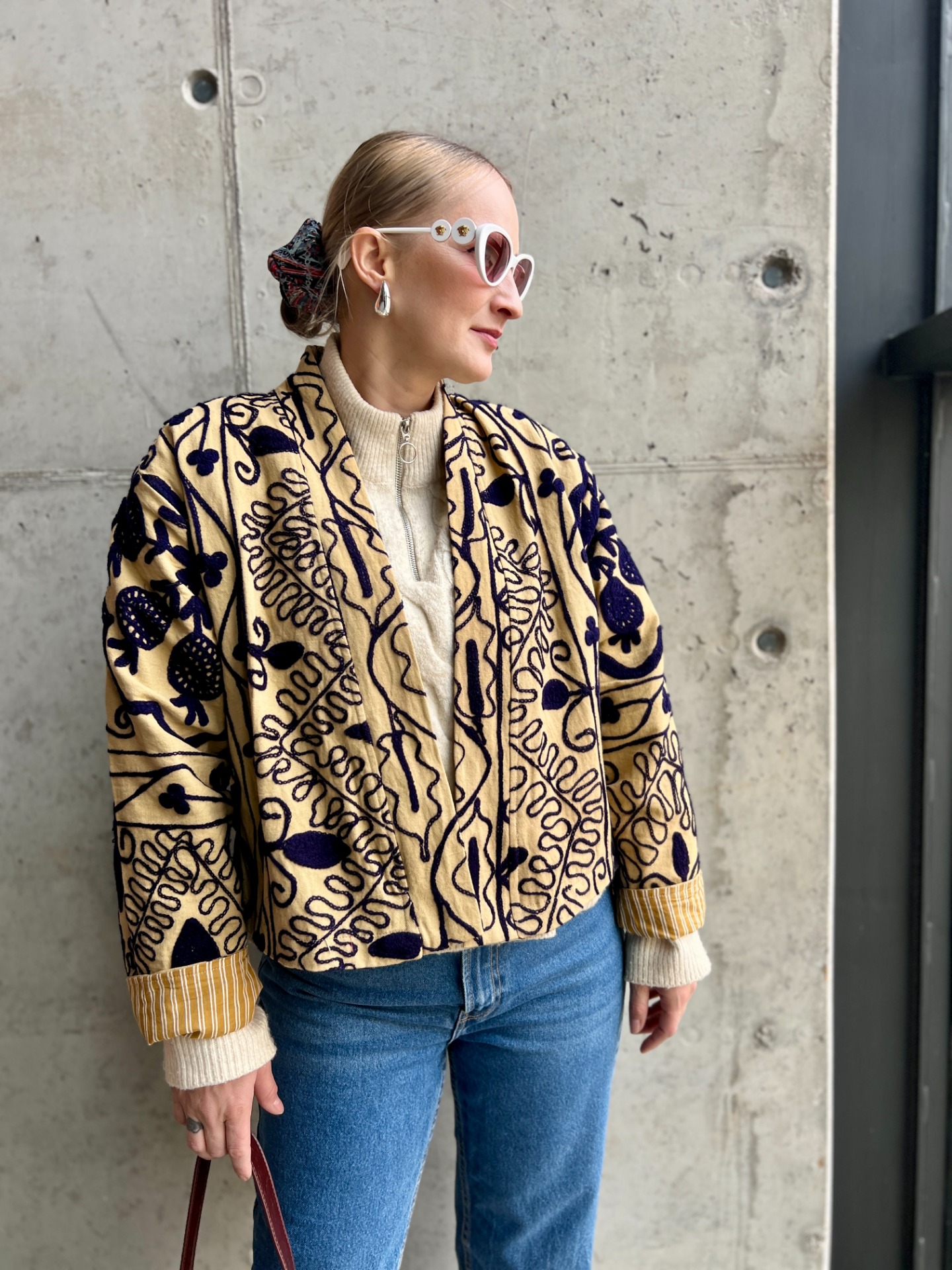 Všetky naše produkty, tak isto aj tento kabátik, sedia na minimálne 3 konfekčné veľkosti.Kabát je vyrobený z bavlneného plátna a po celom obvode je vyrobený s pútavou výšivkou Suzani.