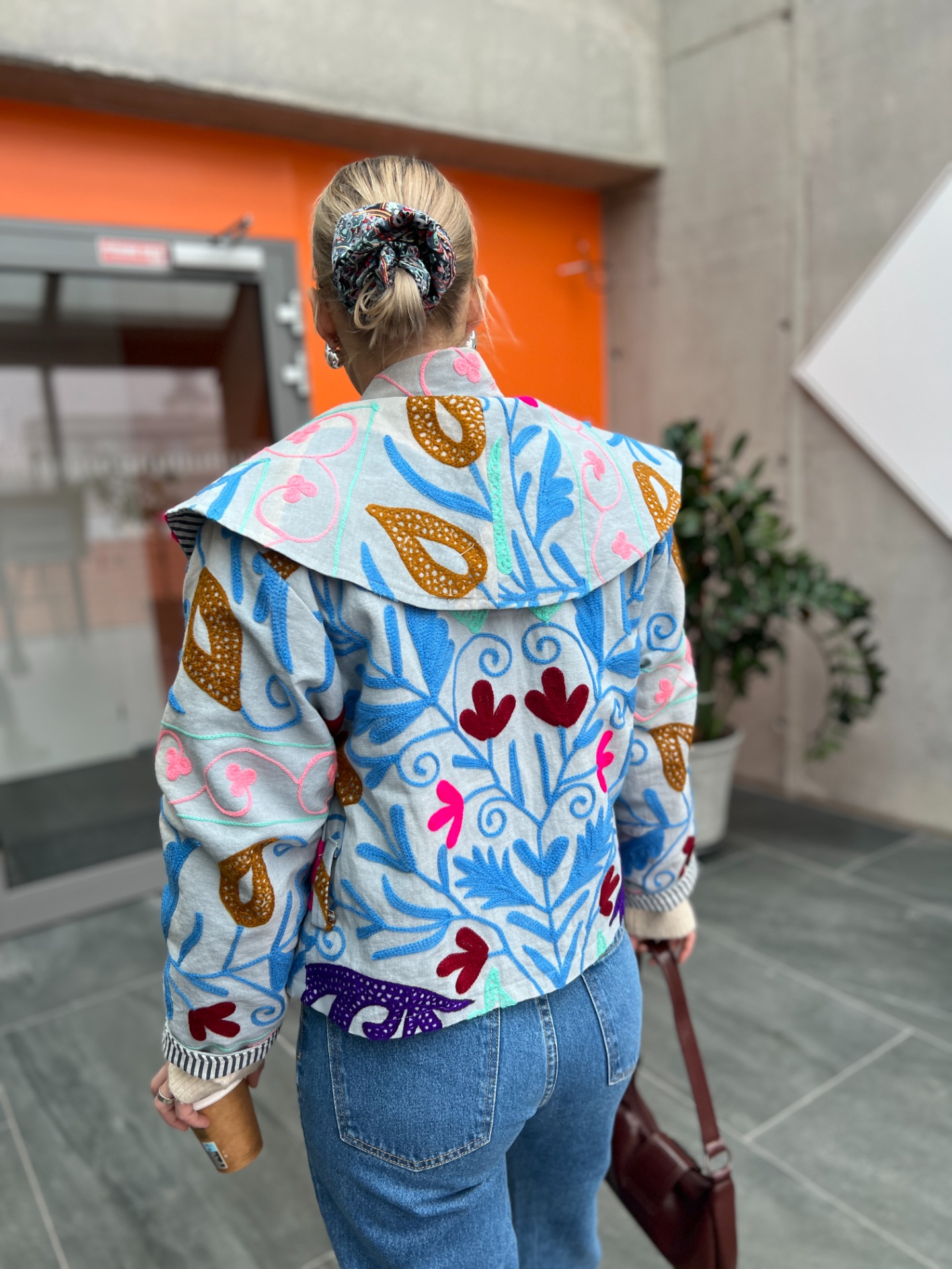 Kabátik je vyrobený remeselníkmi s pomocou bubienka a vytvára tak, jedinečný a živý vzor výšivky.Ak budete odvážna môžete ho nosiť obojstranne.