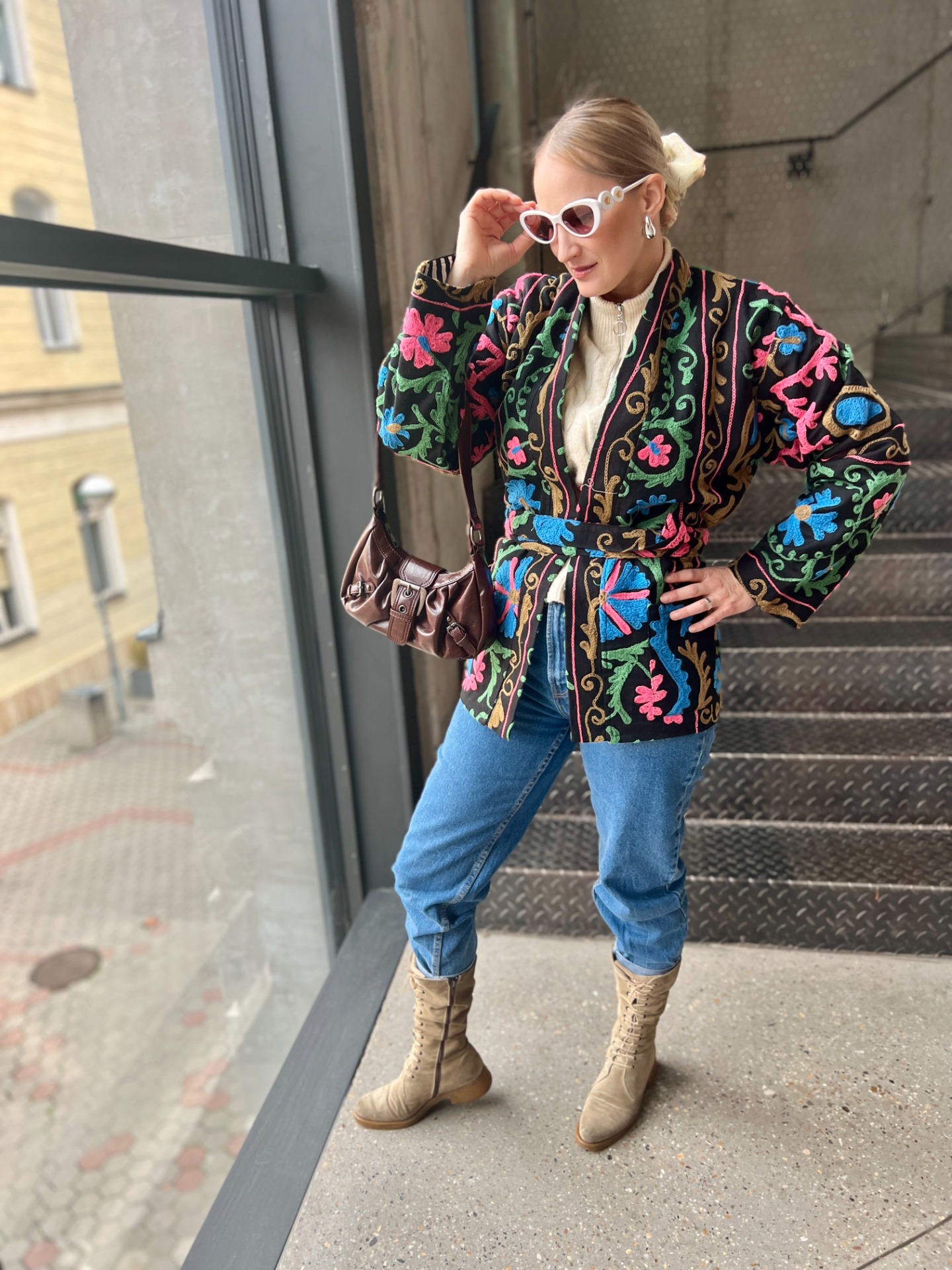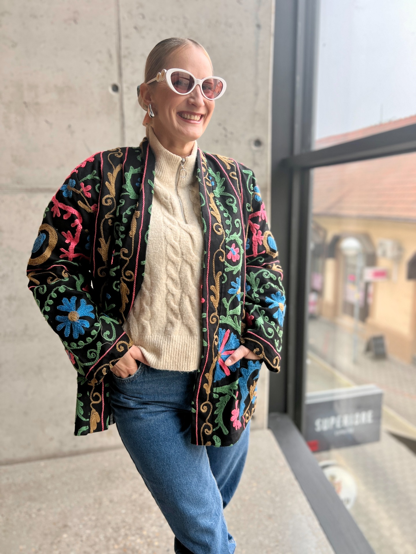 Matilda Suzani Coat vo farbe SelfCare je na pohľad farebne veľmi príjemý kabát, je vyhotovený z pevnejšieho bavlneného plátna a výšivka pôsobí na čiernom podklade ako pohladenie. Rozhodla som sa preto, nazvať ho SelfCare, pretože niekedy nepotrebujeme viac, len si obliecť kabát, ktorý v nás hneď vzbudí odhodlanie, je ako naše brnenie a stávame sa odolnejšou voči čomukoľvek, čo nás cez den stretne.