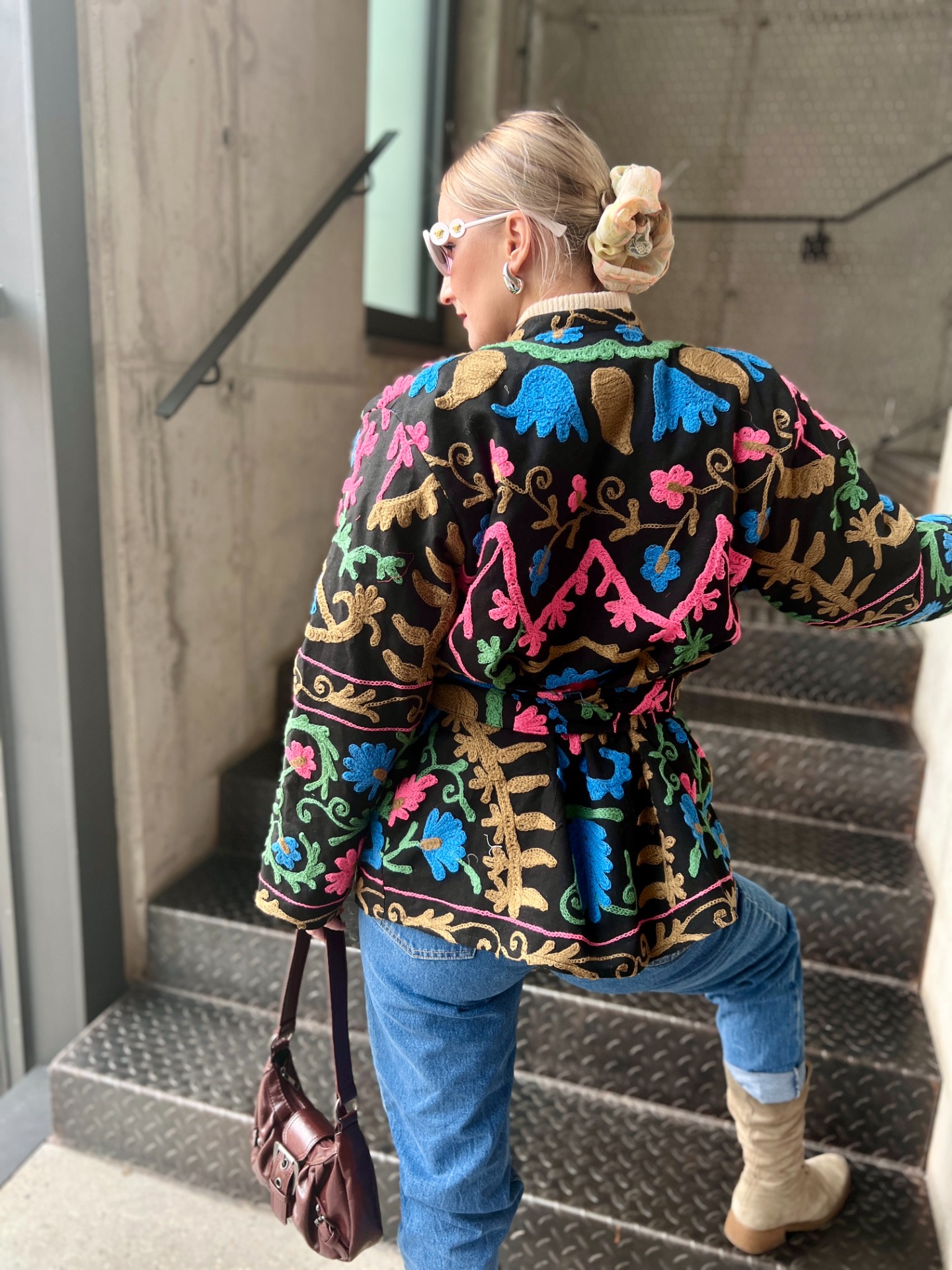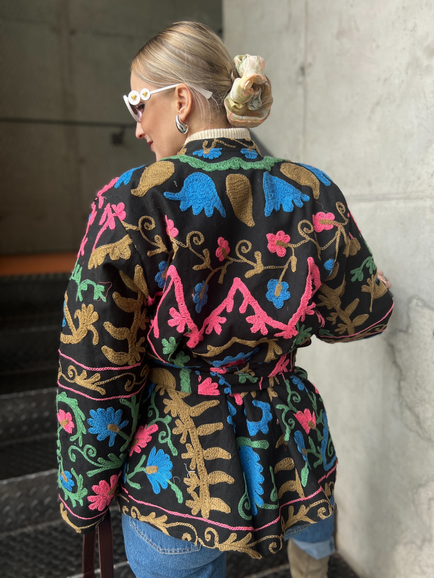Všetky naše produkty, tak isto aj tento kabátik, sedia na minimálne 3 konfekčné veľkosti.Kabát je vyrobený z bavlneného plátna a po celom obvode je vyrobený s pútavou výšivkou Suzani.