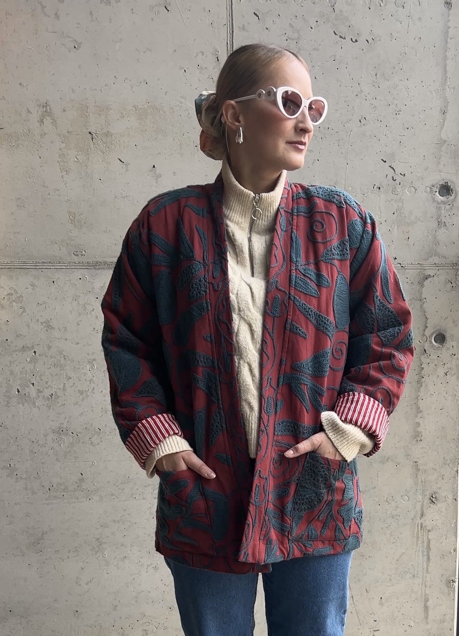 Všetky naše produkty, tak isto aj tento kabátik, sedia na minimálne 3 konfekčné veľkosti.Kabát je vyrobený z bavlneného plátna a po celom obvode je vyrobený s pútavou výšivkou Suzani.