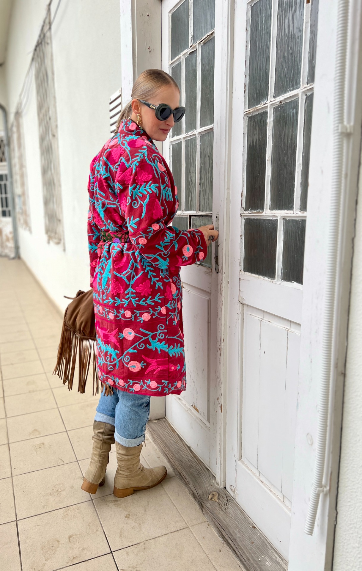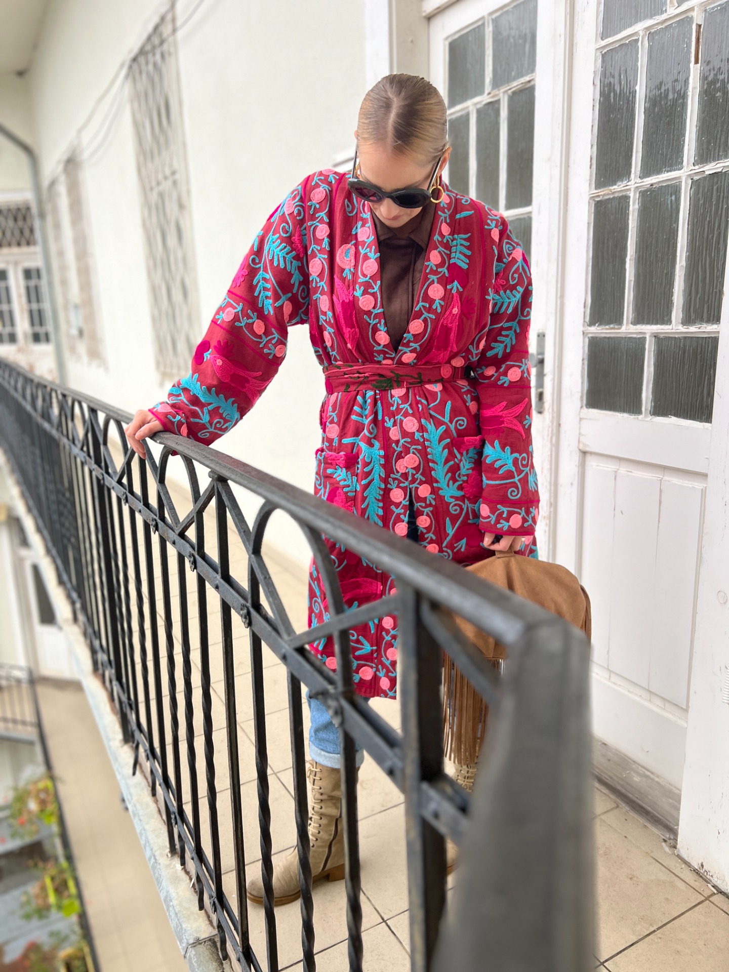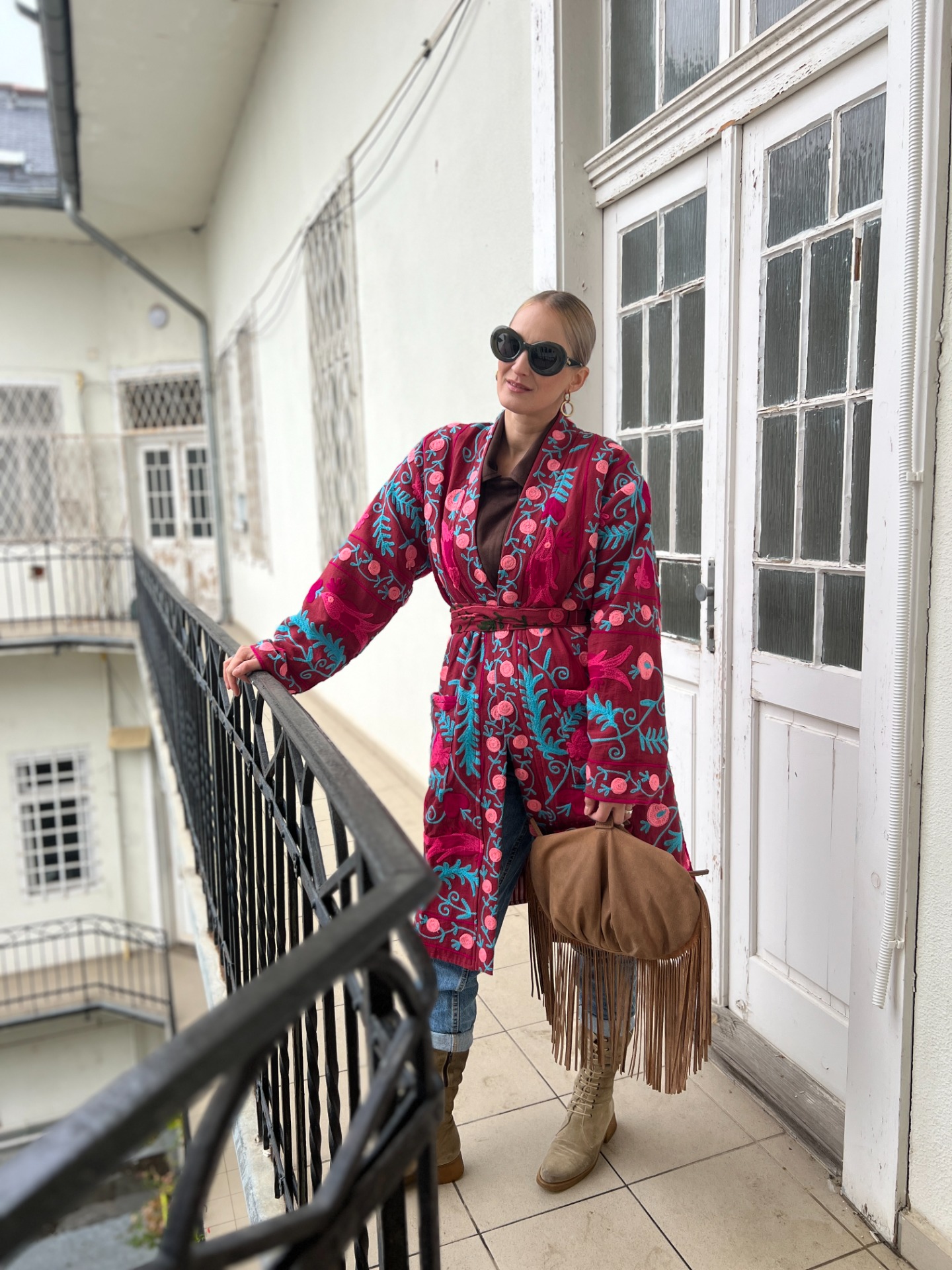 Matilda Suzani Coat s názvom Unicorn je zázračný kabát, ktorý Vám splní všetko čo si dokážete dopriať. Jedinečný kúsok s výšivkou kvietkov, vtáčikov, makových hlavičiek v tej najkrajšej farebnosti burgundy, cyklamenovej a dvoch jemných farieb a to bledulinko modrá a bledučko ružová.