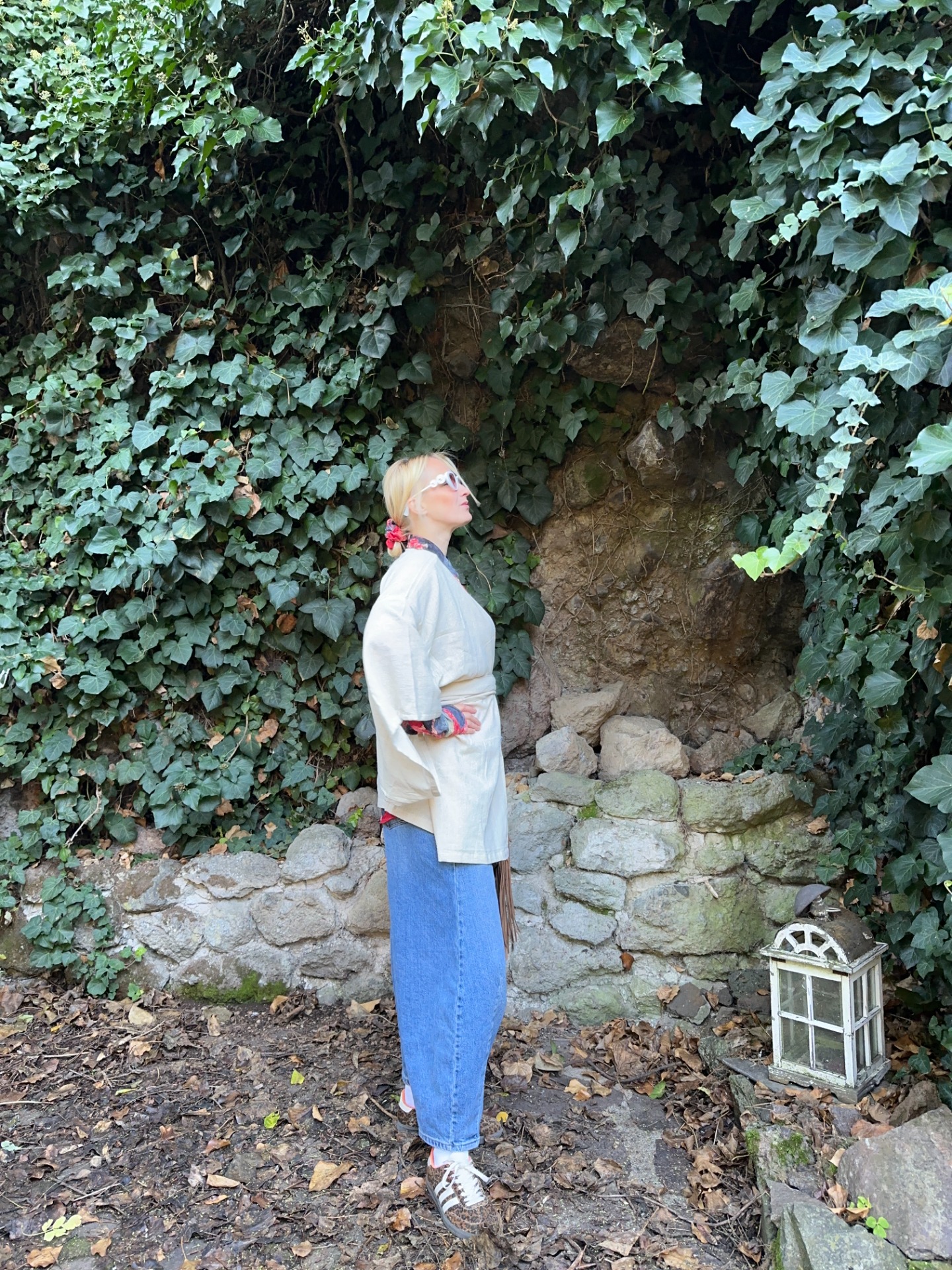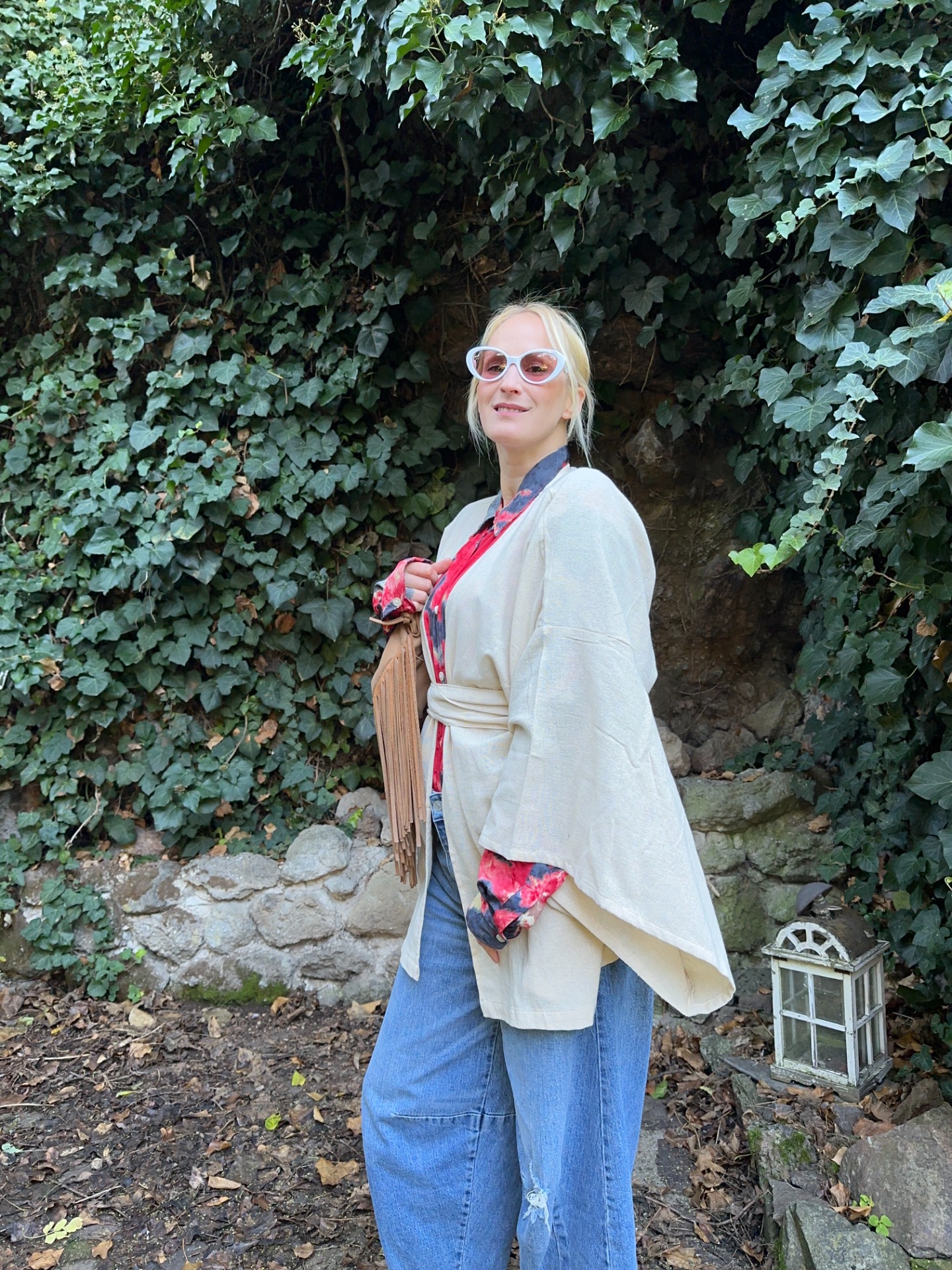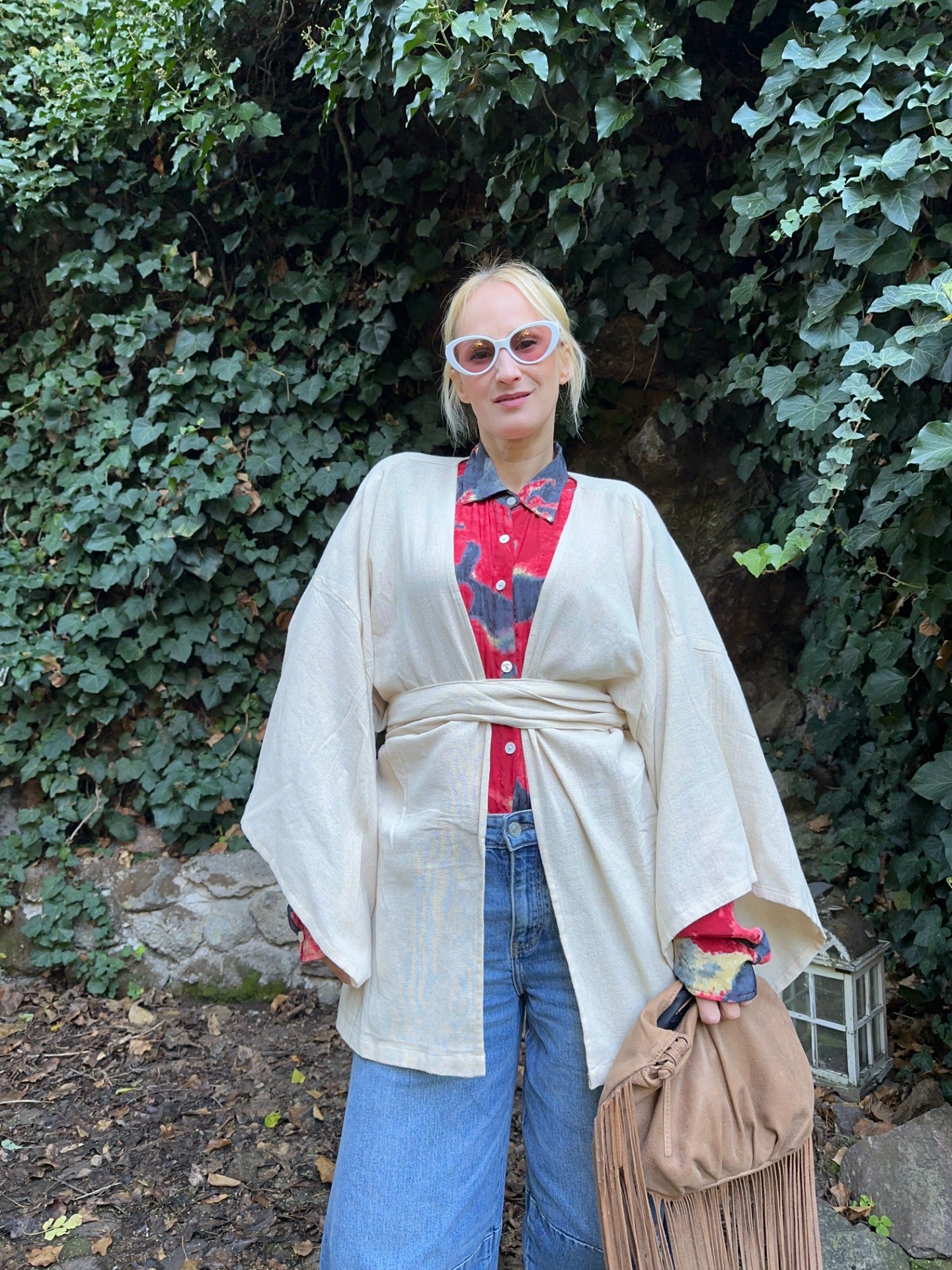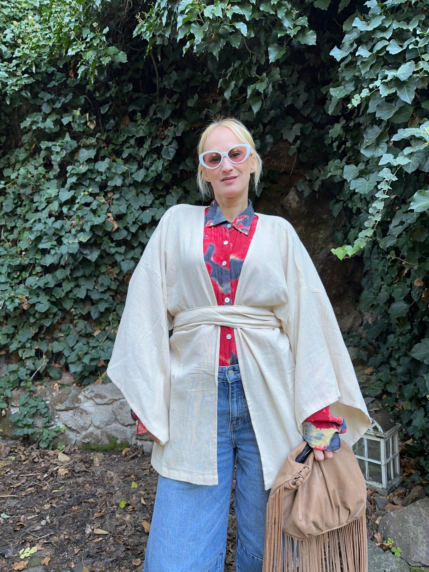 V spodnej časti rukávov nájdete otvory na ruky, ktoré môžete plnohodnotne využiť na varenie, alebo upratovanie. Ak v práci potrebujete pracovať s rukami a milujete krásne rukávy, tak v tomto kimone budú obe potreby obsiahnuté.Kimono je v nádherných farbách a môžete ho využiť na všetky dni, keď túžite byť v sebe, so sebou, s láskou, oddychovať, užívať život.