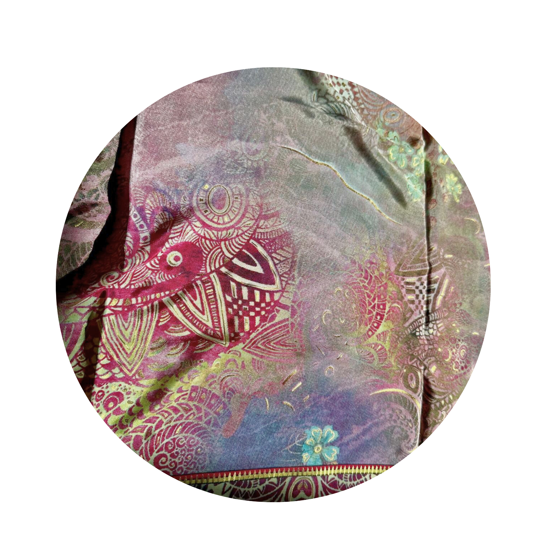 Názov tejto potlače v sebe nesie radosť,krásu a ženskosť morských víl. Farebne sa pozeráte na unikátny kúsok v baklažánovej, bordovofialovej farbe s motívmi kvietkov a mandál v spojení so zlatou kontúrkou.